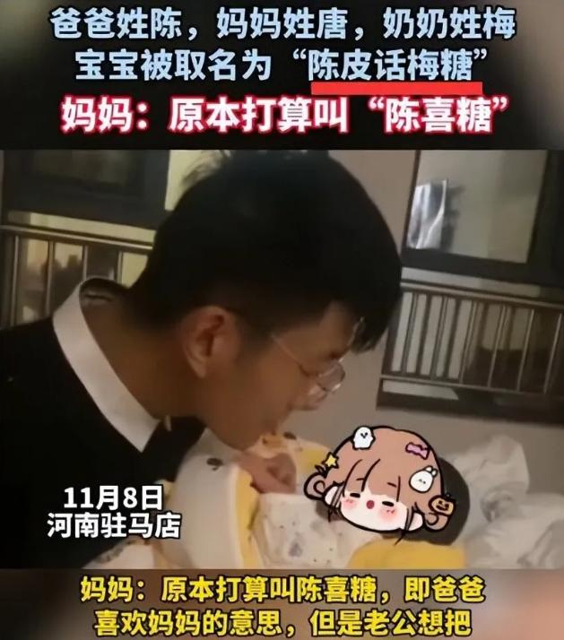 “陳皮話梅糖”大火後,父母出來解釋了孩子名字的由來,原來是爸爸姓陳,媽媽姓唐,奶奶姓梅,一家人的姓氏湊一塊,就取出了“陳皮話梅糖”這個名。