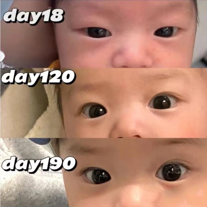 對於剛出生的孩子來說,時間就是把美容刀,指不定那一天,孩子的眼睛、顏值就會反轉。看吧,當初那個眼睛腫着、像一條縫的娃,現在已經長成了一個大眼睛萌娃了,媽媽天天盯着娃看呢。