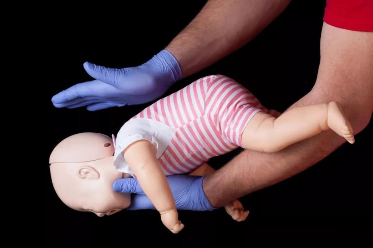 急救時,我們需要把寶寶放在自己的手臂上,讓孩子保持腹部朝下,頭部朝下的姿態。