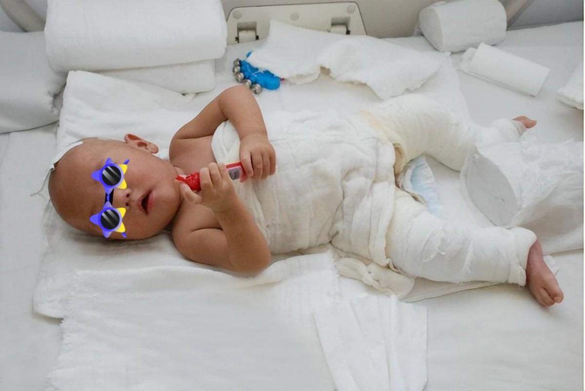 可孩子下巴至胸前、整隻左胳膊以及另一隻手的手指,都有嚴重的燙傷,甚至表層皮膚都被燙掉了。