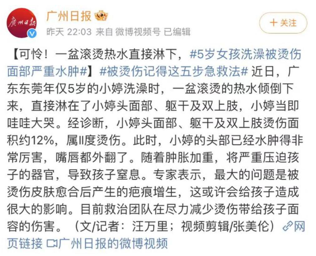 生活處處有驚喜,生活一樣是處處有意外,廣東一個5歲的小女孩小婷,在洗澡的時候媽媽還端了一盆熱水在洗澡間,應該是想着用熱水兌冷水再來洗澡,一個不小心這一盆熱水竟然從天而降,直接撒到小婷的頭上和臉上。#春日生活打卡季#