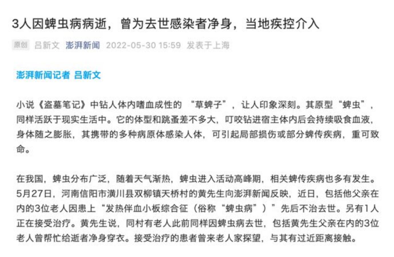 在2022年,河南信陽有一個老人因爲蜱蟲叮咬感染導致去世,後來這個老人去世之後,村裏面其他的老人就幫他淨身更衣,結果幫助淨身更衣的三位老人都感染了蜱蟲病,也叫做發熱伴血小板綜合徵。