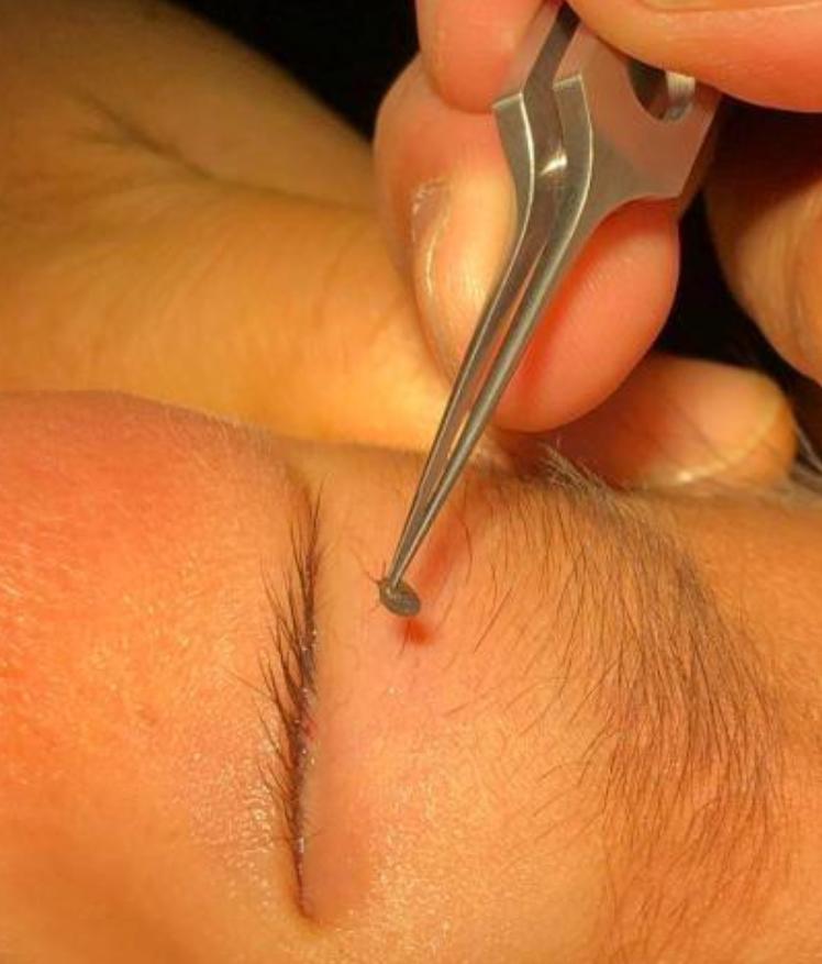 紅黴素眼膏擦完後30分鐘,他就發現這個蜱蟲好像疲軟了,於是爸爸拿起棉籤沾了酒精先給孩子的皮層周圍消上毒,再給眉毛夾消毒。