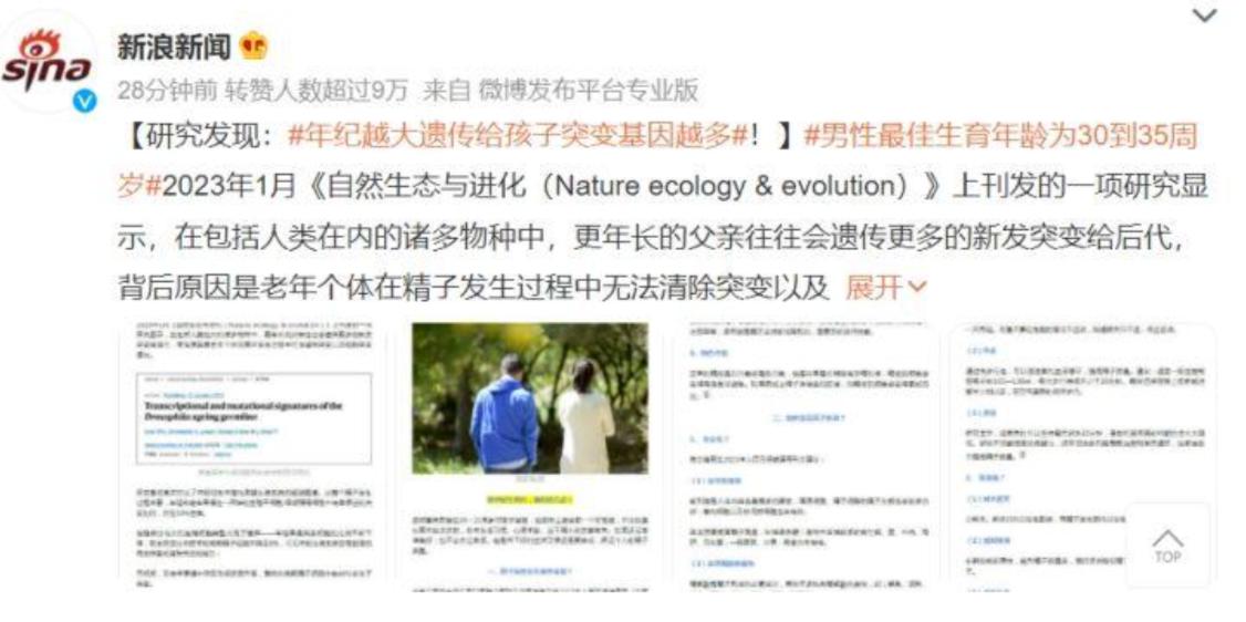 普通人建議35歲之前要生孩子,因爲在2023年1月的《自然生態和進化》上刊發了一則研究顯示,更年長的父親往往會遺傳更多的新發突變給後代。