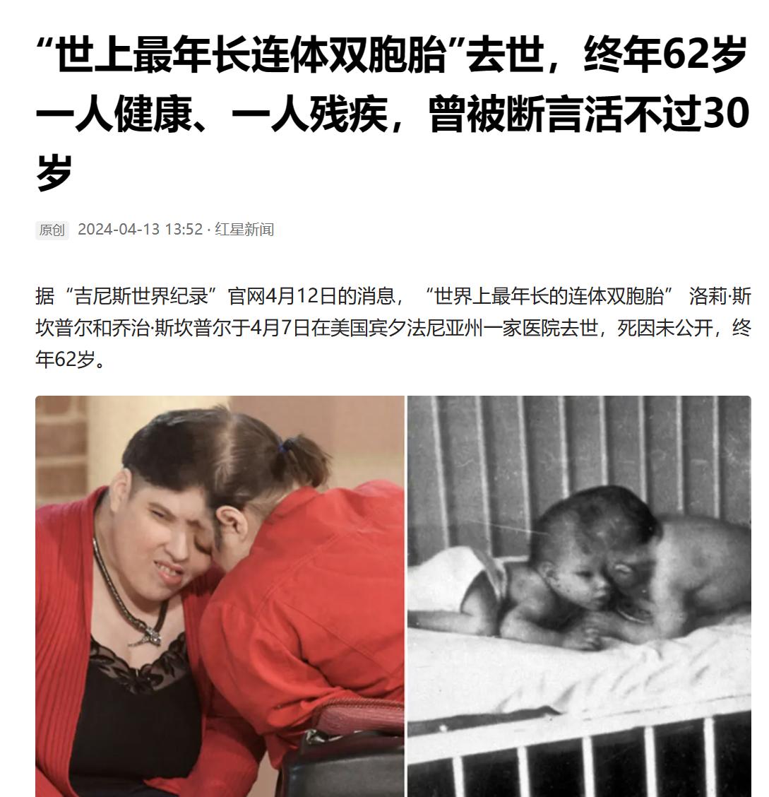 所以這一對連體雙胞胎居然超過了50歲,申請吉尼斯世界記錄的時候就通過了,被稱爲“世界上最年長的連體雙胞胎”,而他們一直存活到了62歲,一直到2024年4月7號纔在美國賓夕法尼亞州一家醫院去世。