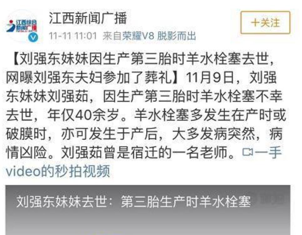 劉強東的妹妹在42歲的時候生育三胎,結果因爲羊水栓塞而不幸離世,要知道劉強東的妹妹可以說有錢有勢,生產的時候肯定也是有很多的醫生作陪,但最終還是因爲羊水栓塞去世了。所以普通的產婦碰到羊水栓塞,如果沒有及時發現,那麼死亡率也是極高的。