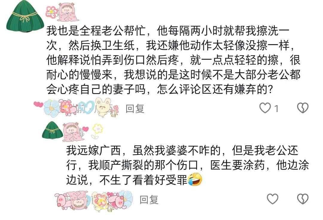 週週是剖宮產,產後身體極度虛弱,自己也顧不上什麼不好意思了。老公願意做這些事,她覺得這是身爲一個丈夫以及父親的責任感。