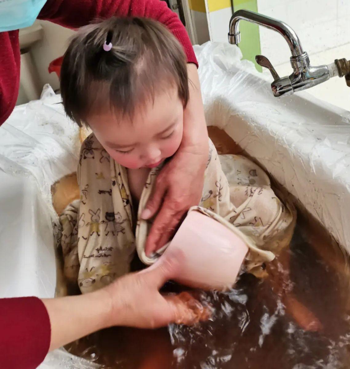 考慮到孩子還小,一個人泡澡不安全,茵茵有懷孕在身,不方便,最後茵茵決定讓孩子的爸爸陪同孩子泡個美美的熱水澡。