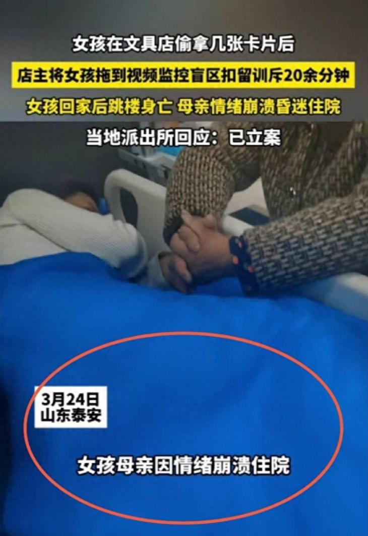 山東一個女孩到文具店買玩具的時候偷拿了老闆的幾張卡片,老闆在監控看到之後就把孩子留在店裏面訓斥了20多分鐘,沒想到女孩回家後跳樓自殺身亡。