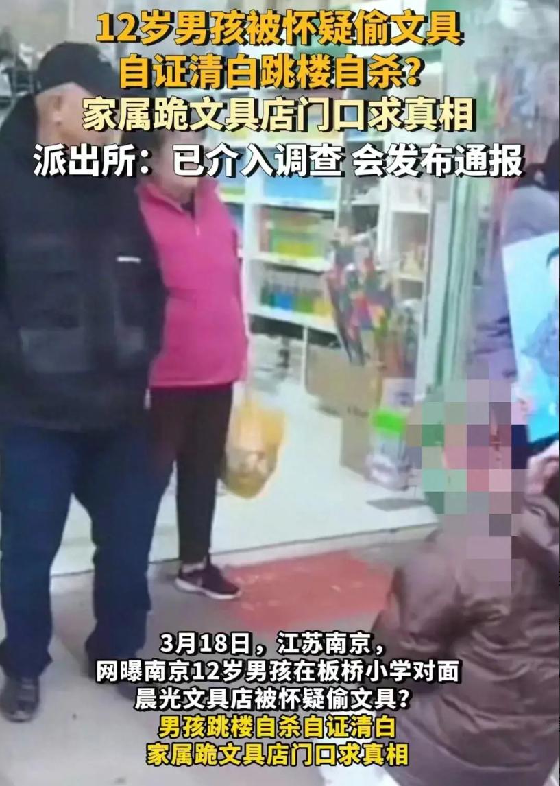南京一個12歲的男孩,在小學對面的文具店拿了文具沒有給錢,老闆就說他偷玩具,男孩,從高樓一跳而下,用生命來自證清白。