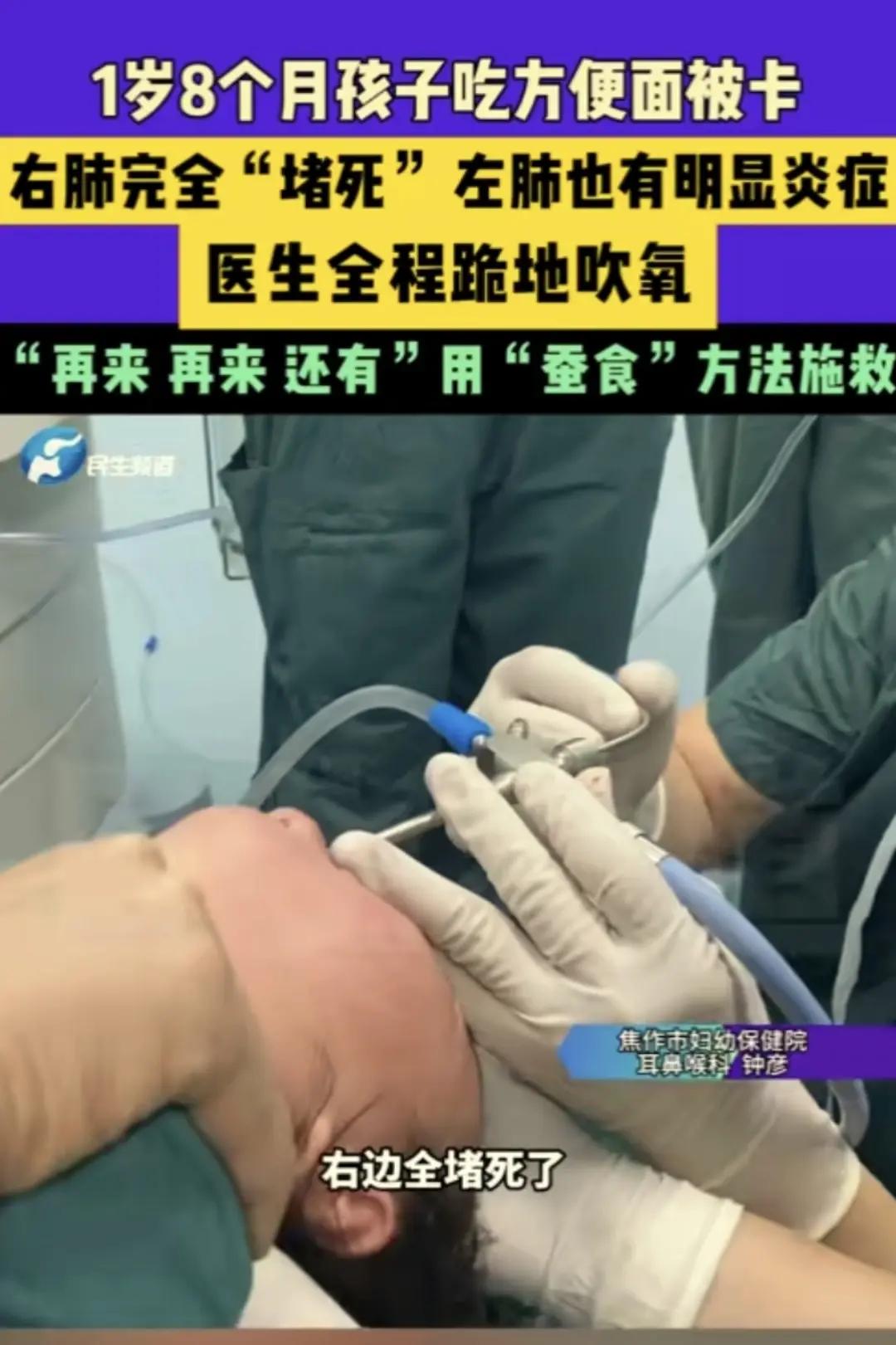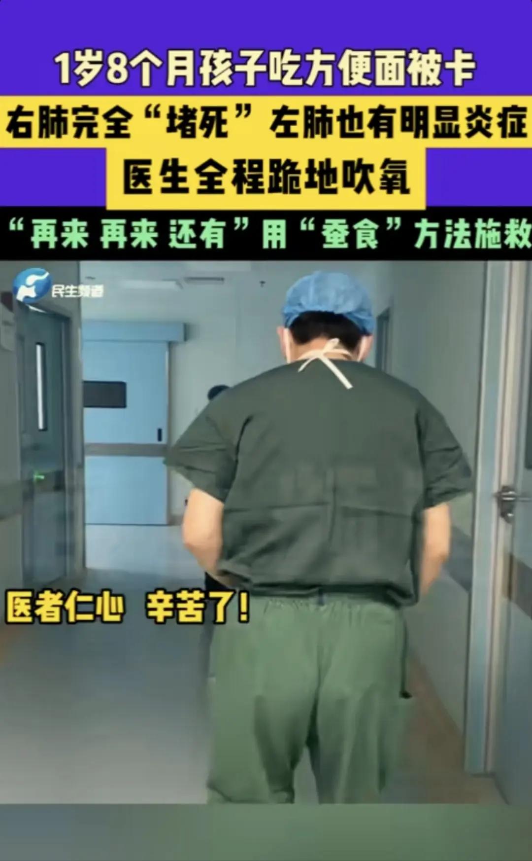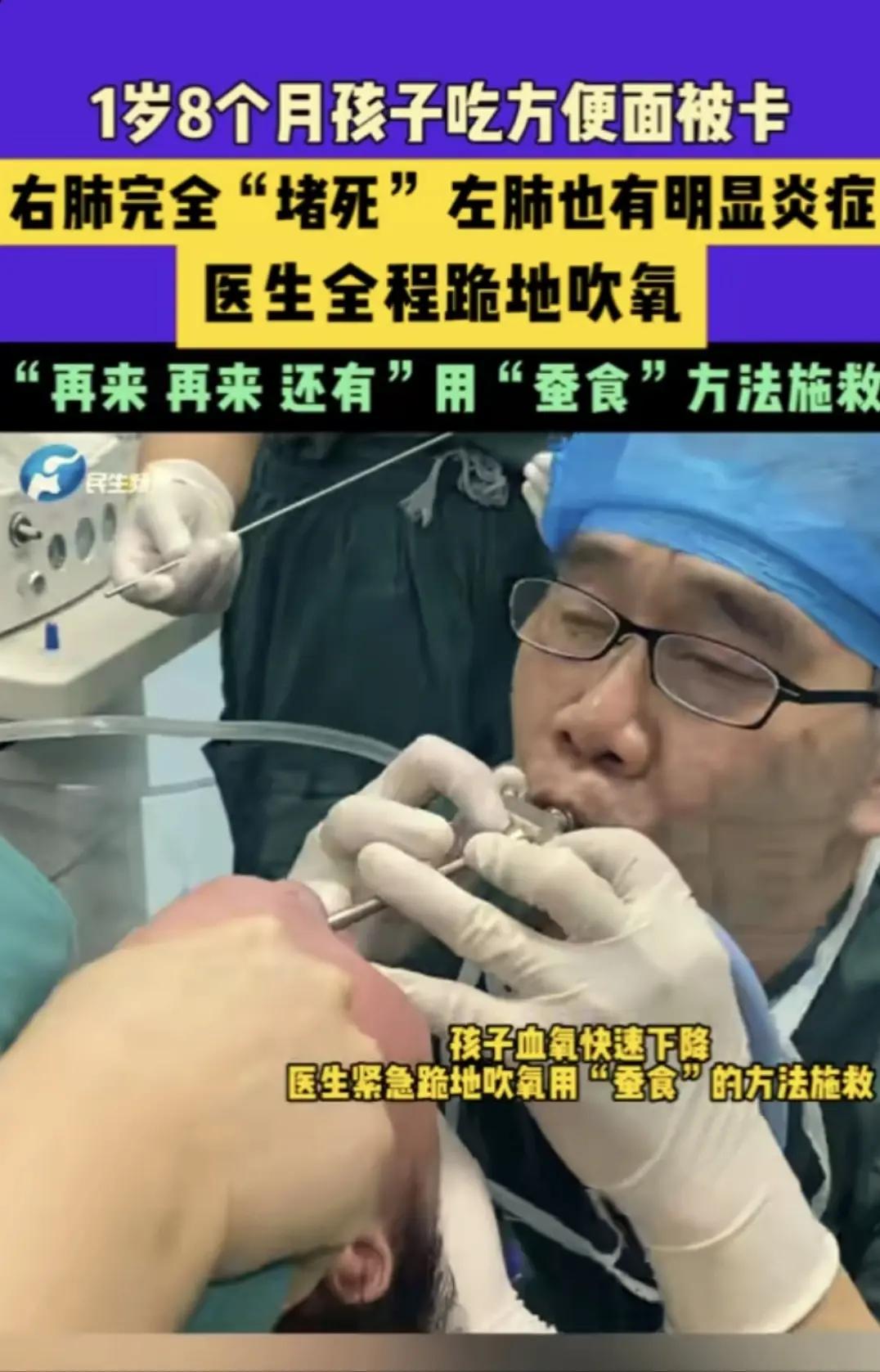 因爲方便麪比較軟,吹出來困難度非常的高,還要掌握力度纔行,只能讓鍾醫生自己來吹,當把所有的方便麪從孩子的肺部吹出來,也就是手術成功的時候,鍾醫生整個腿都要軟了,因爲一直跪着導致血液循環不暢。