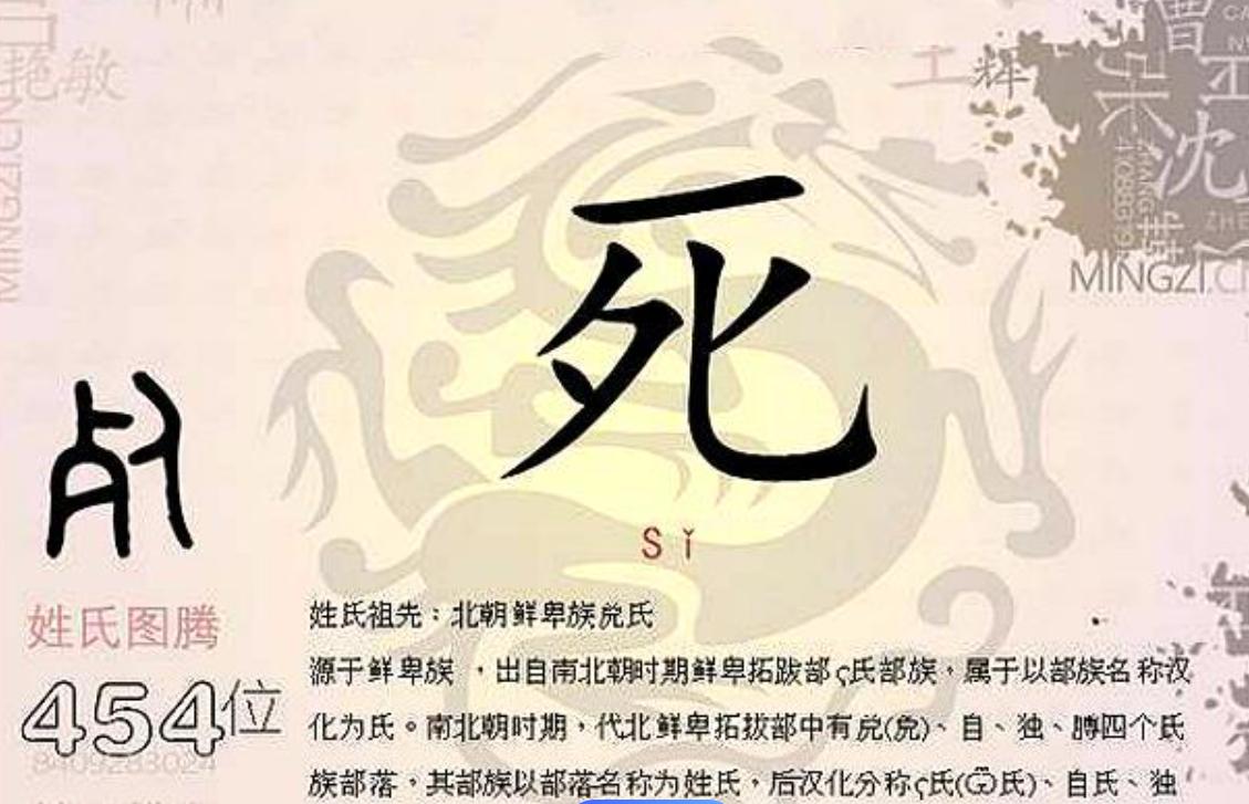 死姓源於南北朝時期的鮮卑族,因爲是本身包含着不吉利的意思,在全國大概有1000人。