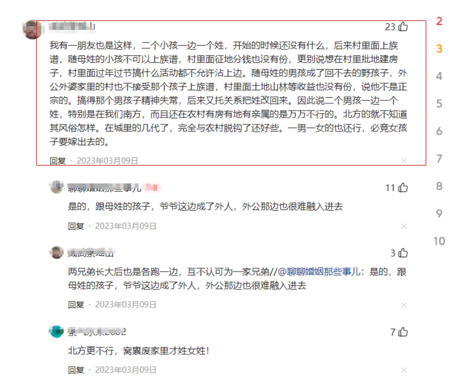 一個網友提起自己真實的案例,一個孩子跟爸姓,一個孩子跟媽姓,結果村裏上族譜的時候跟媽媽姓的小孩不可以上族譜,村裏面徵地分錢也沒有份,在村裏想要批地建房子什麼的,都跟這個跟媽媽姓的孩子沒有任何的關係。