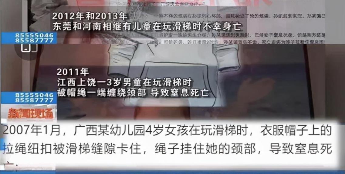 結果因爲她把外套的繩子給拿了出來,而且在玩滑梯的時候,不小心外套上的繩子卡在滑梯的縫隙裏面,剛好就繞住她的脖子,自己整個身體的重量加上繩子被卡住一下拿不出來,沒到一分鐘她就被勒得窒息了。