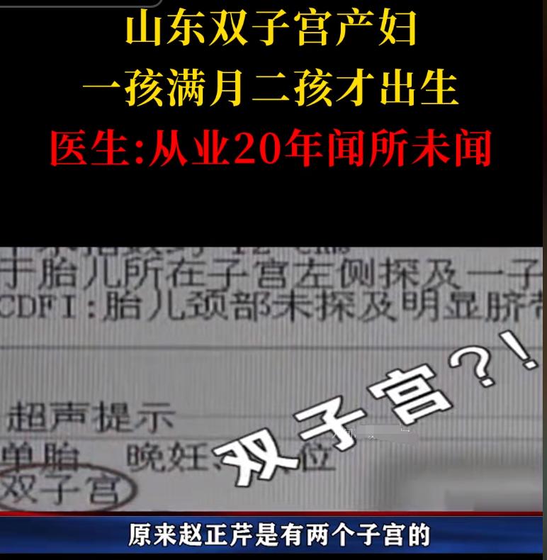 醫生覺得非常地詫異:剛纔那個兒子是怎麼出生的?爲什麼這個那麼久沒出生,還以爲是宮外孕。後來趙正芹說自己是雙子宮。醫生再詳細檢查才知道:原來剛纔兒子出生的那個子宮已經開始收縮了,而另一個孩子在另外一個子宮還安然無恙,因爲他的預產期還沒有到。