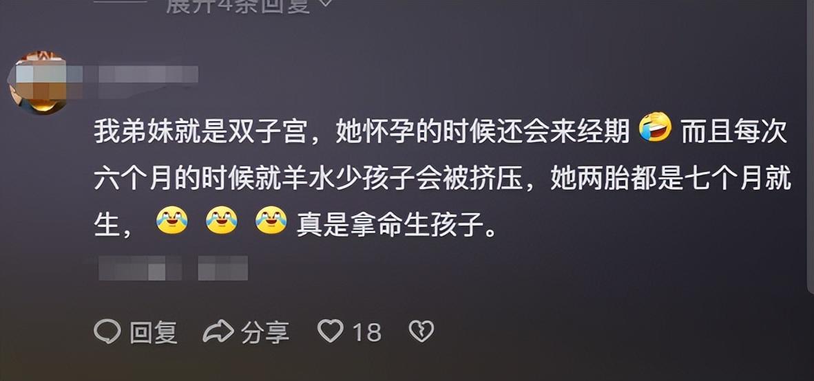 還有網友說自己弟妹是雙子宮,懷孕的時候還來月經,而且兩胎都是七個月就生。