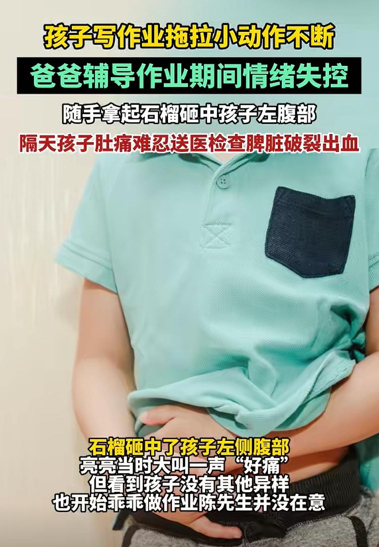 比如說爸爸在輔導作業的時候孩子不會寫,而且磨磨蹭蹭,爸爸就非常的生氣,這時候其實是有情緒的,在有情緒的時候打孩子很容易手勁過大,可能把孩子打壞了。比如說,這個孩子的脾破裂以及被爸爸踢得腸穿孔的,都是因爲在氣頭之下下手不知輕重。
