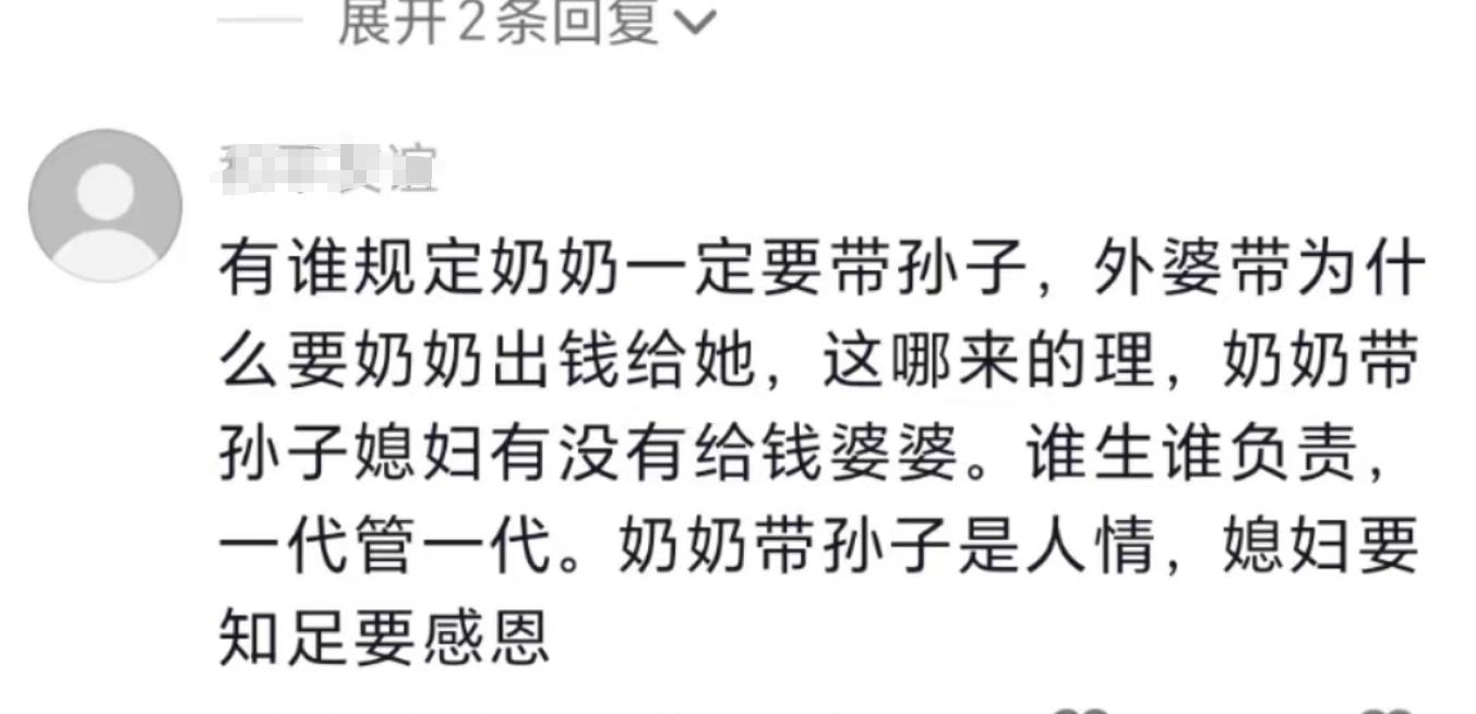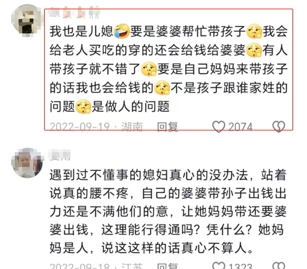 也有作爲兒媳婦的網友在下面評論說:要是婆婆幫忙帶孩子,我會給老人買喫的穿的還會給錢,有人帶孩子就不錯了……