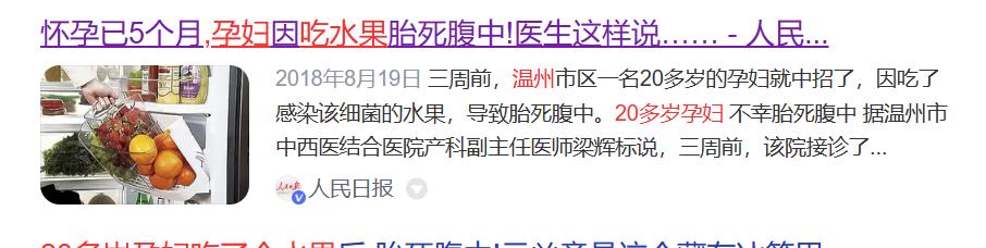 《人民日報》就曾經報道過,溫州一個20多歲的孕婦,喫了感染李斯特菌的水果,導致死腹中。杭州一個二胎媽媽喫了冰箱裏面的剩菜,第2天就不舒服發燒,然後去醫院檢查之後,發現是李斯特菌感染,後來已經出現了宮縮,只能剖腹產生下一個只有1750克的早產寶寶。