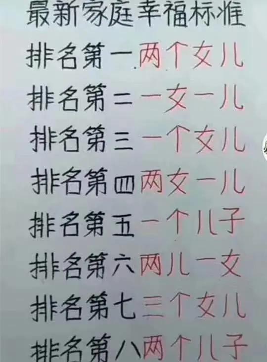 調查結果顯示:兩個女兒的家庭,幸福指數排在第一名,一兒一女排在第二名,而生了兩個兒子的家庭就排在最末位。