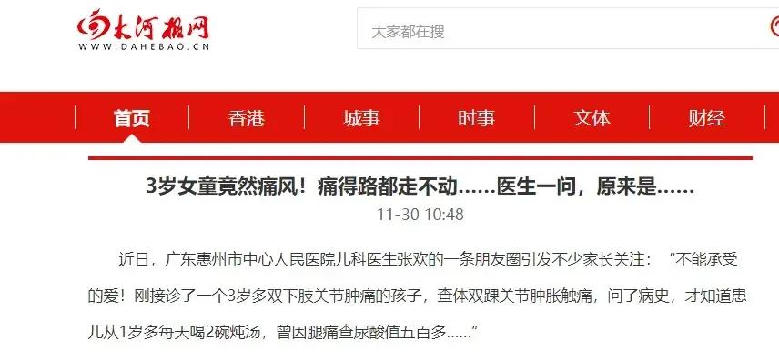 廣東惠州有個小女孩,從一歲開始,奶奶爲了讓她的營養更好一些,每天都會讓她喝兩碗老火湯,孩子喝了兩年,一直到孩子三歲的時候,有一次喝了一碗豆腐花之後就出現了嚴重的腳疼,兩個踝關節又紅又腫,一碰就痛,下地走路都走不了。