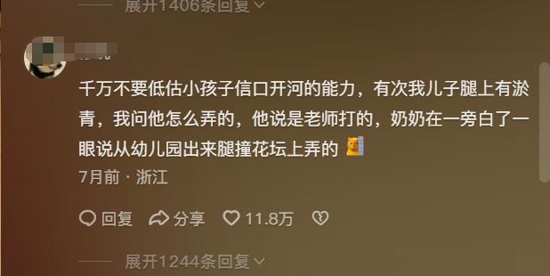 還有網友說看到兒子腳上有一塊淤血的時候,他就問兒子怎麼回事?兒子說:被老師打的。結果旁邊接他回來的奶奶翻了一下白眼說:哪裏是被老師打的,是從幼兒園出來腿撞花壇上弄的……