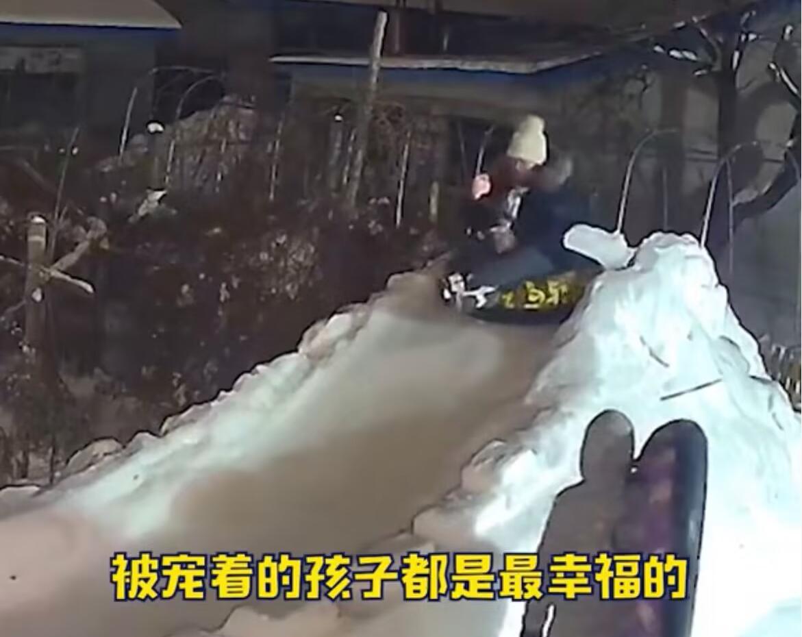 她一次一次的在雪滑梯上玩,爸爸就像個騎士一樣站在旁邊,默默的守護着她。用她的話來說,雪滑梯會融化,但爸爸的愛不會!