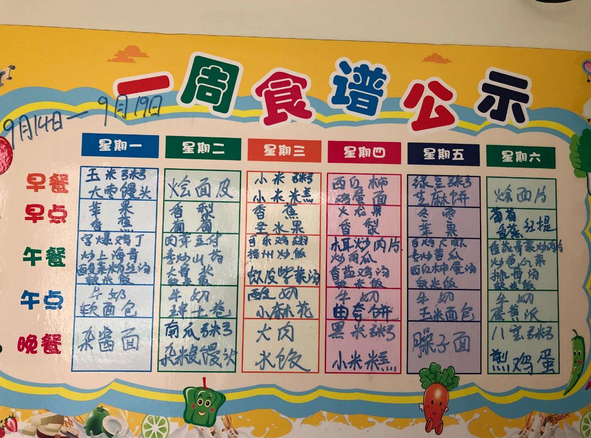 正常情況下,幼兒園都會把每週的食譜掛在幼兒園的宣傳欄上,而每天喫什麼有些老師也會拍着發給家長。