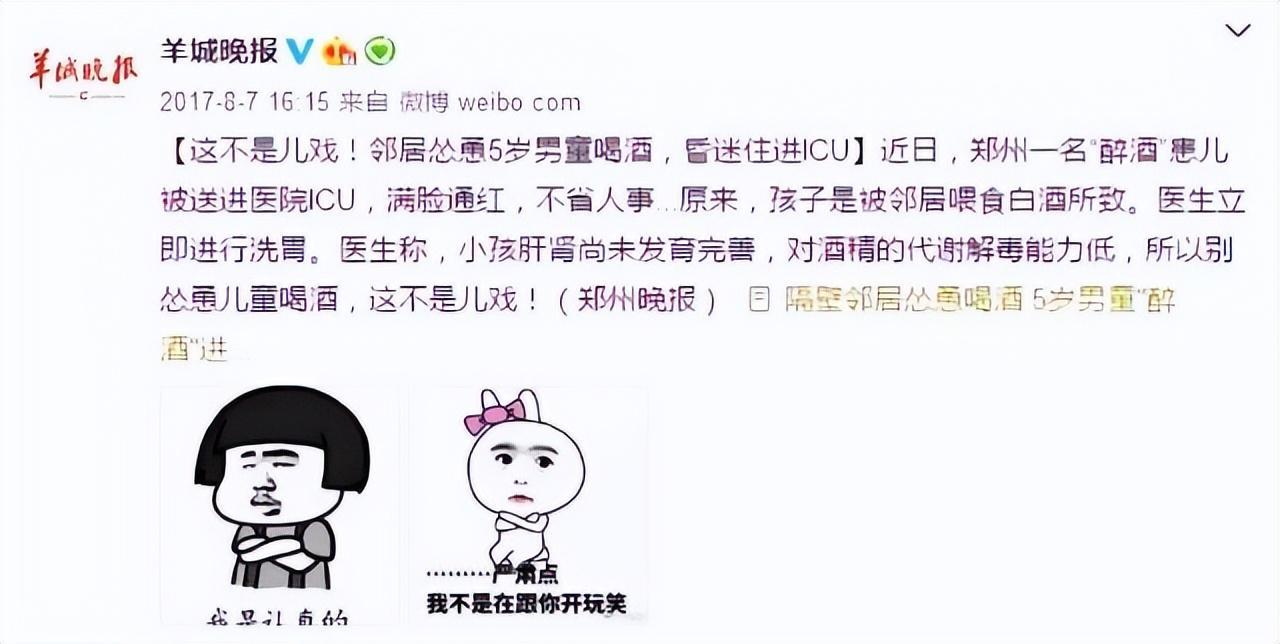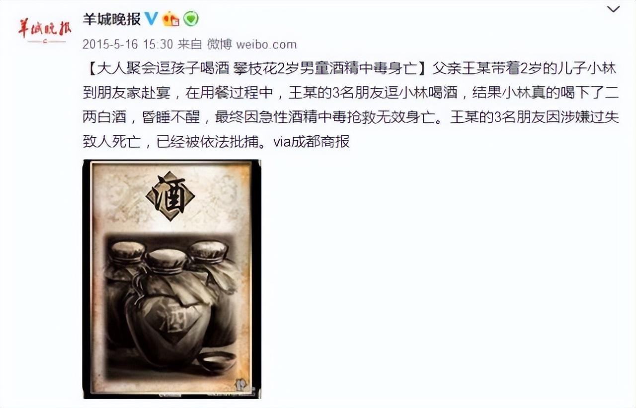 而四川有一個兩歲的小男孩就更加可憐了,爸爸跟叔叔們一起喝酒就逗着他喝酒,結果小朋友喝下了二兩白酒,昏迷不醒,最後因爲急性酒精中毒,搶救無效死亡。