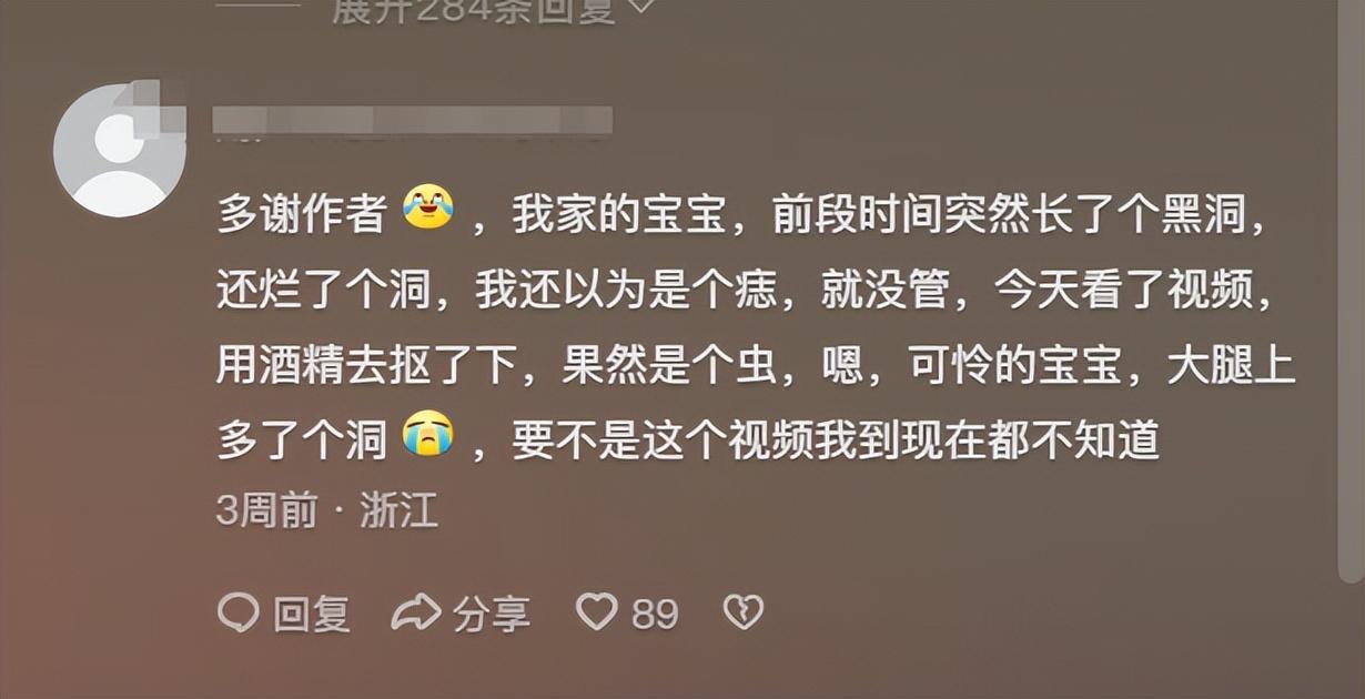 其中一個網友在看到這個視頻的時候,就想起自己孩子的大腿上長了個黑洞,還爛了個洞,媽媽還以爲是一顆痣也沒管,而看了視頻之後就拿酒精去滴在上面,然後輕輕的摳了一下,果然是隻蜱蟲……這個媽媽感嘆:幸好看了這個視頻,要不然現在還不知道。