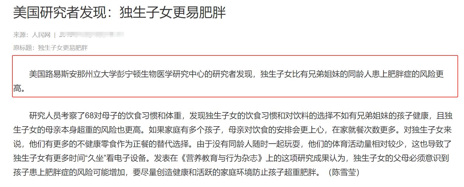 第1個研究:獨生子女肥胖率更高