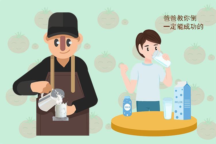 早晨喫飯的時候,媽媽把牛奶放在桌子上,就去拿麪包了。亮亮拿起牛奶往杯子裏倒,一下子倒在了自己的衣服上。