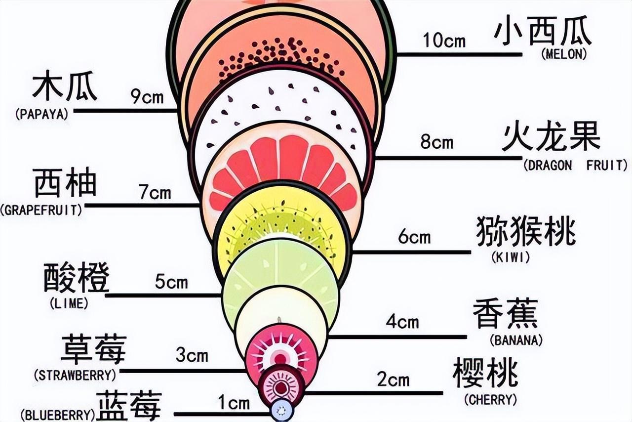 宮開1釐米就像一個藍莓一樣,到2釐米像個櫻桃,3釐米像個草莓,4釐米像香蕉,5釐米是酸橙,到10釐米就像一個小西瓜。這就是水果的橫切面,特別是到10釐米的時候,我們買一個小西瓜,就發現這個新生兒的頭確實跟西瓜的橫切面差不多。