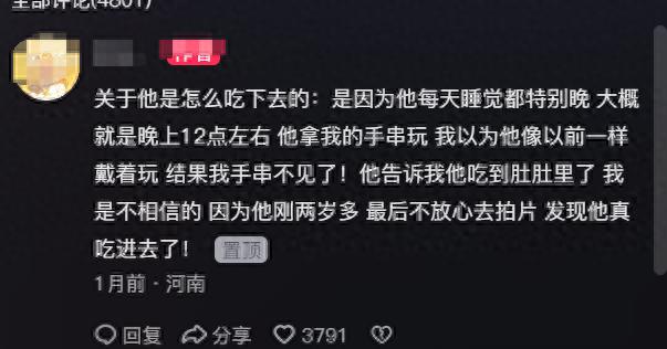 於是就一直開燈找,但是都找不到,孩子就堅持說:媽媽我已經吞到肚肚裏面去了。當天晚上媽媽還安慰自己說這麼大的手串,孩子肯定吞不到肚子裏面去了,沒事先睡覺吧,明天再找,結果第2天還是找不到。