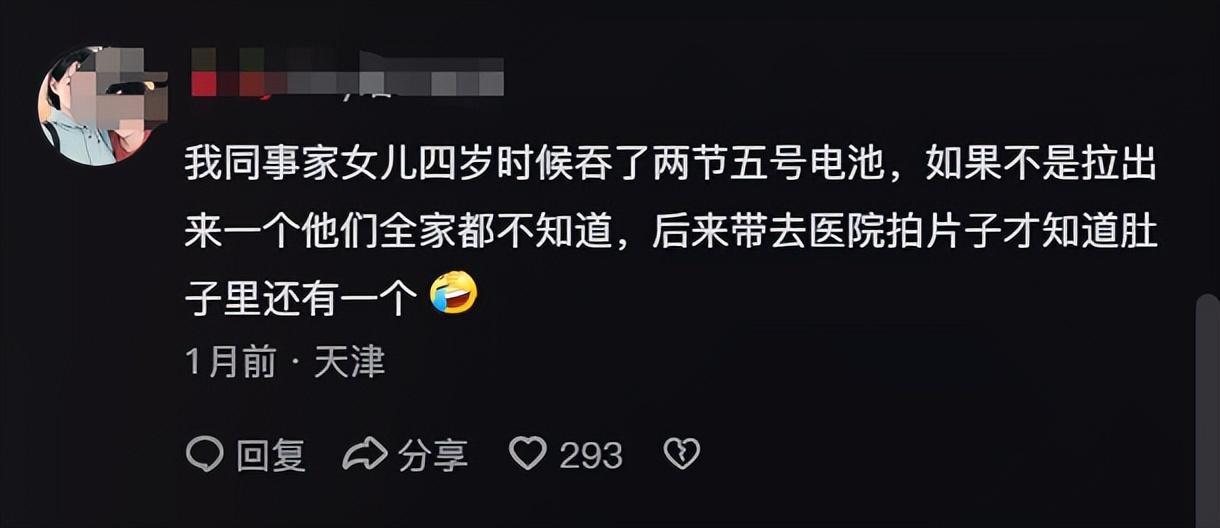 有網友說自己同事家4歲的女兒吞了兩節5號電池,拉出來了一個之後家人再帶孩子去拍片子,才發現肚子裏面還有一個。