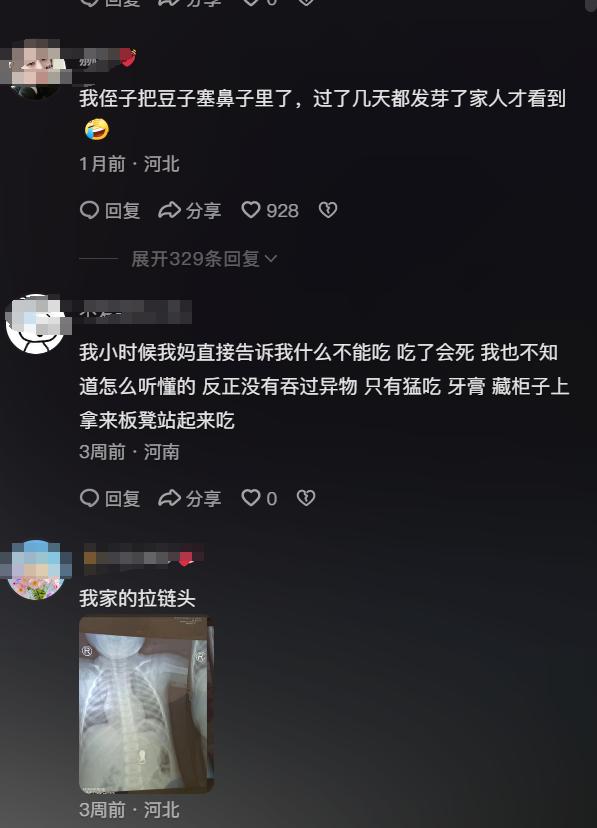 而網友們也紛紛說起自己孩子的其他經歷,有網友說自己的侄子把豆子塞到鼻子裏面,過了幾天發芽了,家長才看到。還有網友說自己家的孩子喫了拉鍊頭,結果去醫院照腹部CT也看到了。