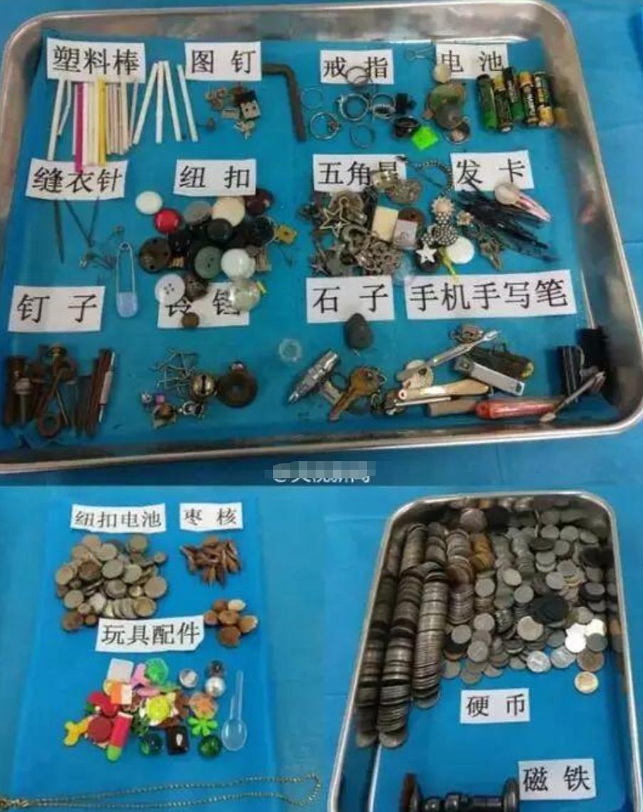 而西安市兒童醫院有一面牆壁專門展示着孩子們誤吞後經過手術取出來的物品。有戒指,有圖釘,塑料棒,還有縫衣針,還有磁力珠等五花八門的東西,那這些孩子就不夠幸運了,他們在吞進去這些東西的時候,沒有依靠自己能力拉出來,而不得不到醫院去動手術,把這些物品取出來。