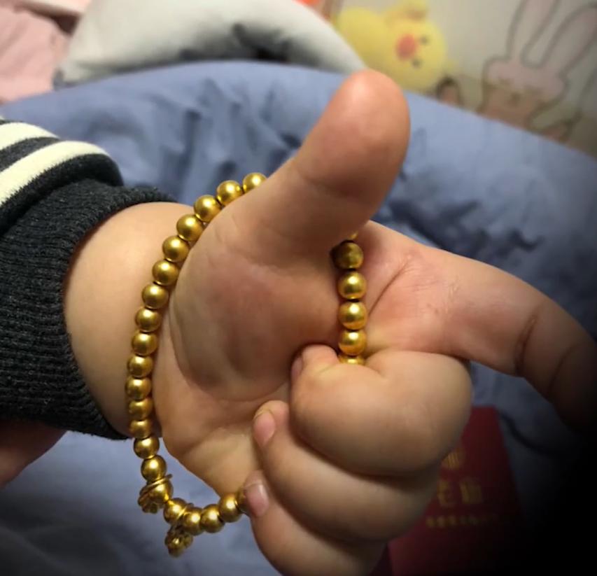 一個媽媽平時經常帶着一串金手串,這天晚上已經12點多了,孩子還沒有睡覺,就跟媽媽說:媽媽我想玩一下你的金手串。而媽媽平時也給孩子玩過,就很無所謂地把這個金手串拿着給孩子玩!