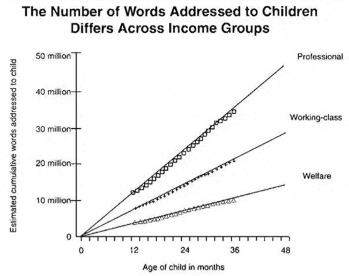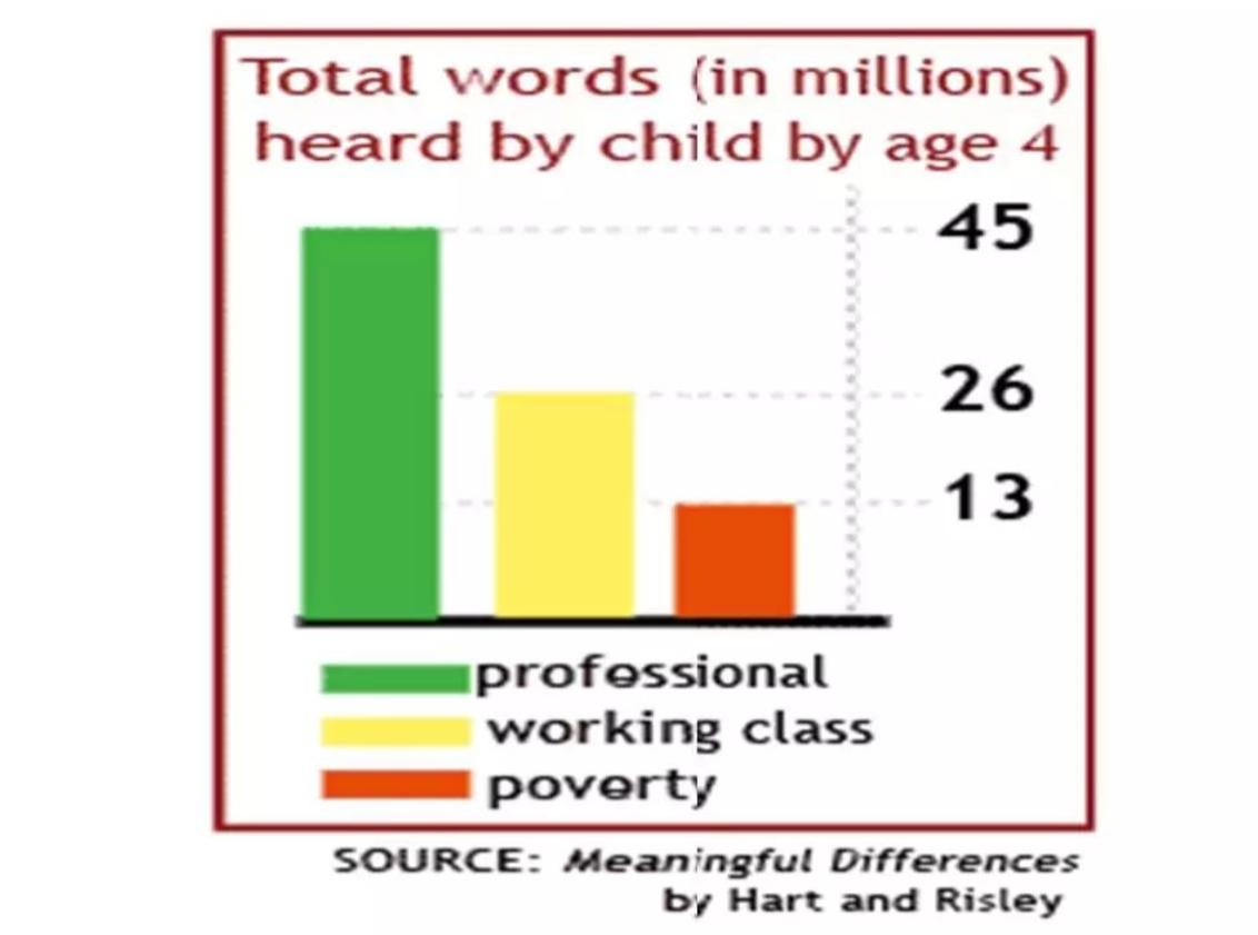 腦力勞動家庭的孩子,到三歲的時候累計聽到的單詞量是4,500萬個,而接受福利救治家庭的孩子,三歲的時候累計聽到的單詞量是1,300萬個單詞,相當於相差了3,200萬的單詞。