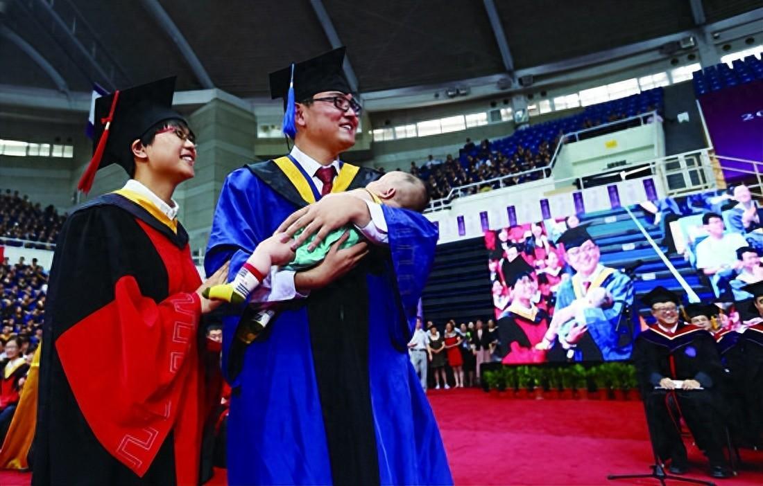 我之前在網上看到過,在校學生帶着孩子一起讀書,抱着孩子一起參加畢業典禮,別提有神氣了。