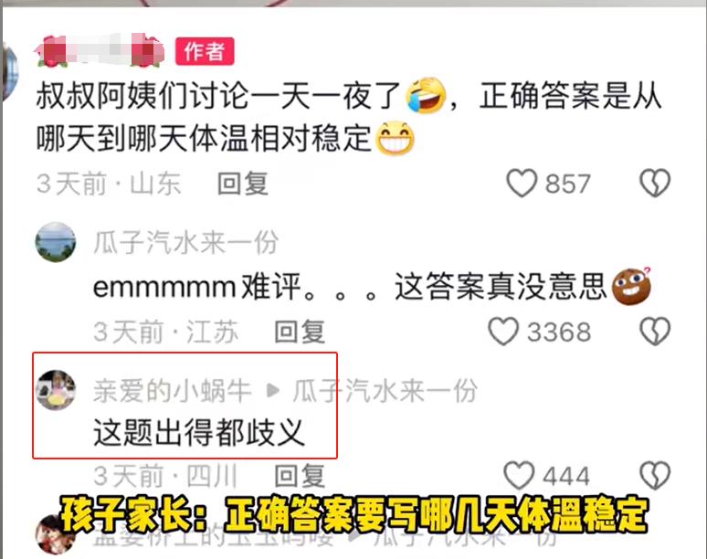 甚至還有不少醫生穿上自己的工作服給這個孩子背書,還有醫生說已經會診過了,孩子的答案是正確的。後來家長就把正確的答案公佈了出來,正確的答案是:從哪天到哪天體溫是相對穩定。