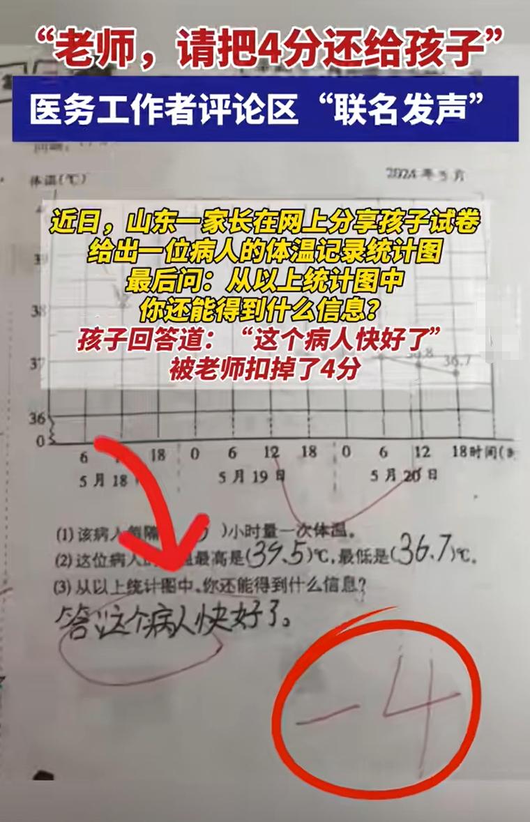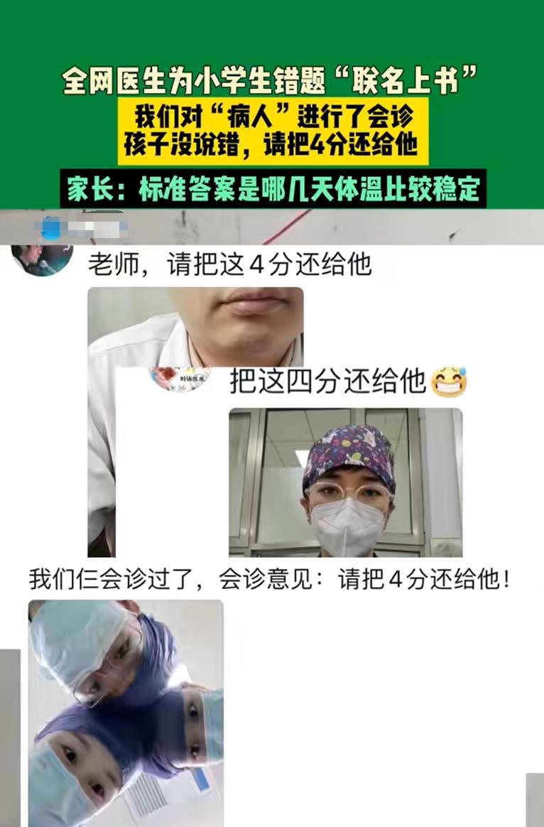 也就是最後一個答案是錯的,被扣了四分,媽媽看到這樣的一個扣分也覺得似乎有點不太恰當,於是就把孩子改好的這張卷子發到網上,結果全網的醫生聯名發聲爲這個孩子做背書,說經過會診確實是這個病人的病情準備好了。