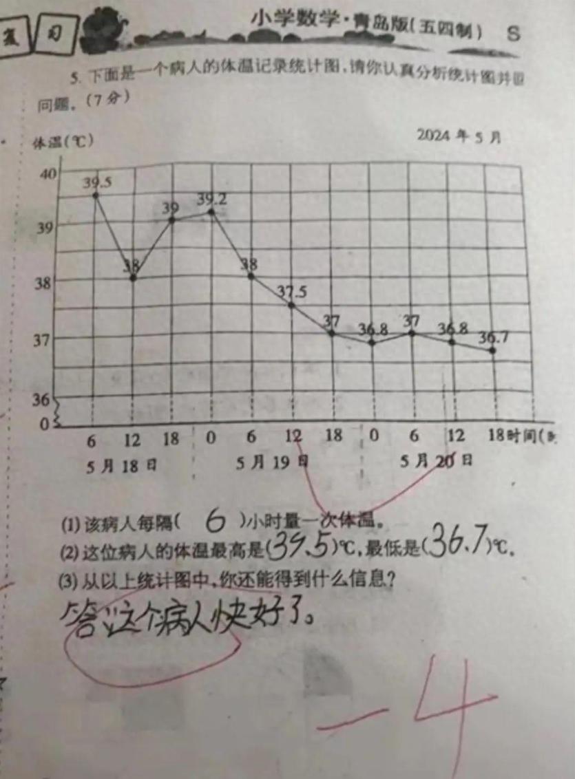 山東一個家長在網上分享了自己家孩子的數學卷子,其中有一道題:一個病人三天之內的體溫記錄統計圖,前面的一天半時間這個病人的體溫是比較高,都是處於38℃~39.5℃之間,之後體溫慢慢趨於正常,最後的一天時間體溫都是在36.7℃到37℃,也是屬於正常的體溫。
