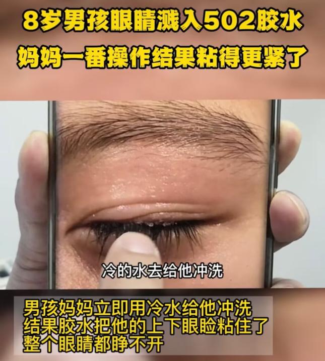 廣東深圳一個8歲的男孩,在做手工時,不小心被502膠水濺入到了眼睛裏。媽媽見狀,立即用冷水爲孩子沖洗眼睛,並並敷上溼潤的毛巾以減輕不適,隨後緊急送往醫院。遺憾的是,到達醫院後,孩子的上下眼瞼已緊密貼合,無法自行分開。