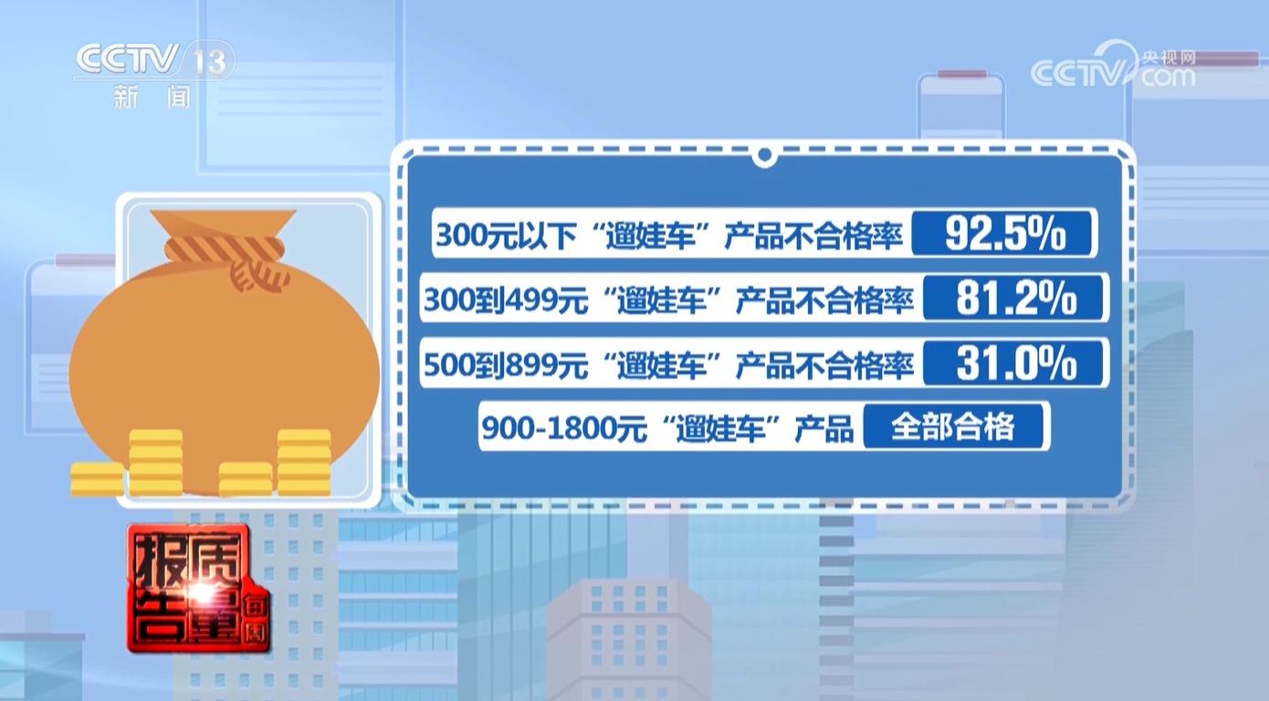 中國玩具和嬰童用品協會摸底調查了106批次的遛娃車,其中300元以下的遛娃車銷售量超過100萬輛,產品不合格率高達92.5%。300~499元的遛娃車,產品不合格率高達81.2%。500~ 899元的遛娃車產品不合格率高達31%。而900~1800元的遛娃車產品全部合格。