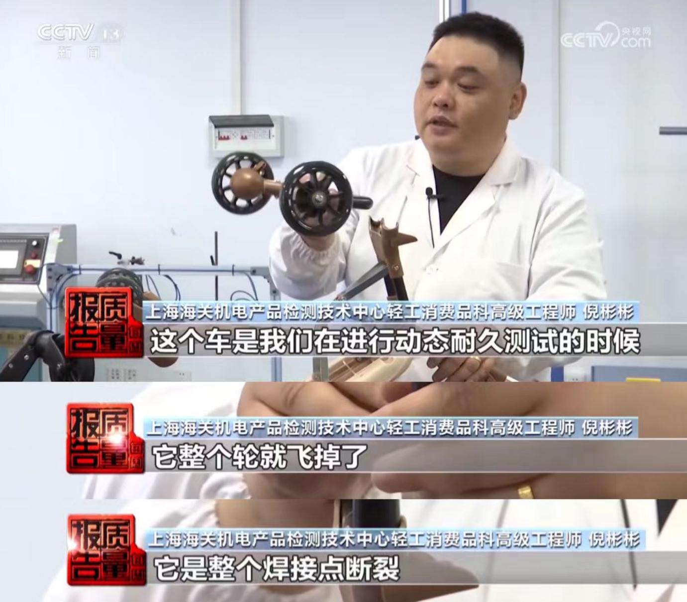 上海海關機電產品檢測技術中心的工程師在對這些遛娃車進行動態耐久測試的時候,也就是讓遛娃車的輪子不停的轉動,沒多久整個輪子都飛了,而且是焊接點斷裂,工程師估計如果是正常使用的話,一個多月就會發生這樣的情況。