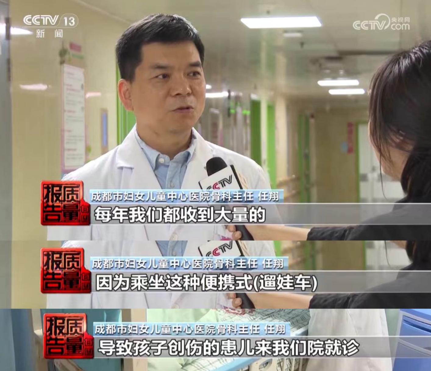 而成都市婦女兒童中心醫院骨科的主任任翔也提到,每年都會收到大量乘坐這種便攜式遛娃車導致創傷的孩子來到醫院就診,大部分孩子是因爲坐在遛娃車上,然後摔倒導致的骨折,皮膚挫裂創傷,還有一些孩子被車上的尖銳表面刺傷,或者是遛娃車配件被孩子誤食誤吞。