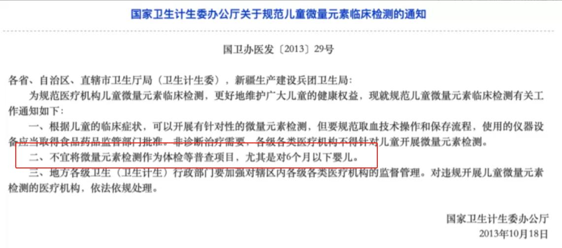 後來國家衛健委親自叫停了,在2013年,國家衛健委就發了一份文件說不能把微量元素檢查作爲兒科的常規檢查,沒有特殊的情況就是不能進行檢查。