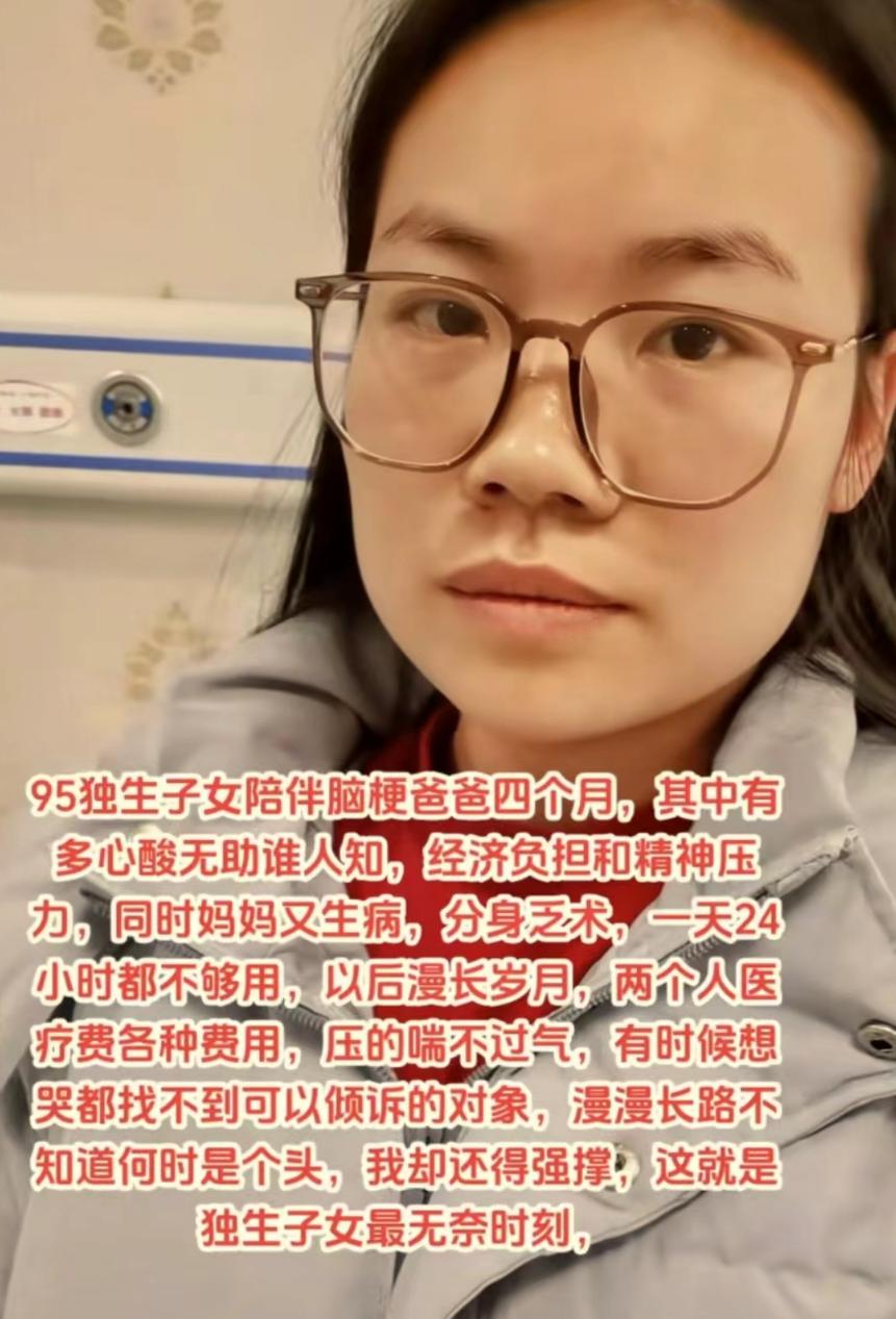 貴州遵義一個95後的獨生女,爸爸因爲腦梗導致四肢癱瘓,胃癱瘓,而媽媽又因爲生病沒有辦法照顧爸爸,所以她只能辭去工作照顧爸爸。