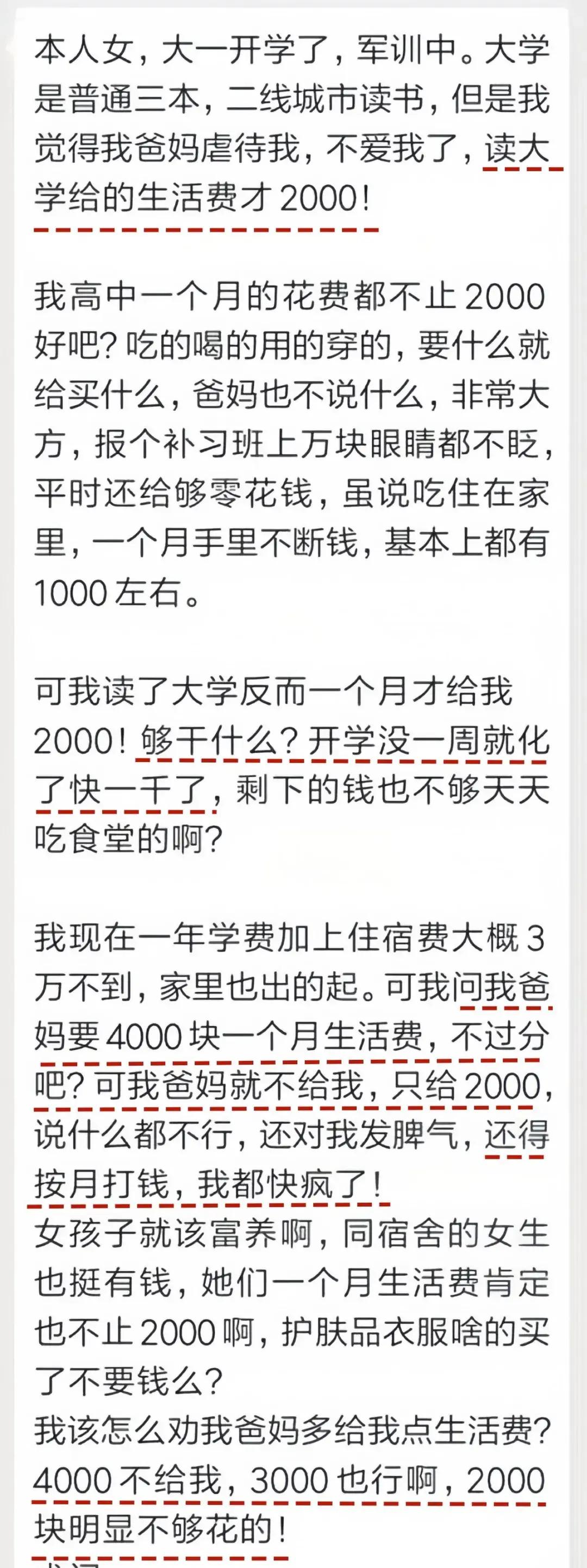 曾看過一個大學生髮的抱怨貼,說自己在某新一線城市上學,每個月生活費只有2000元,根本不夠花,於是就和母親提出將生活費增加爲4500元,卻被一口拒絕。